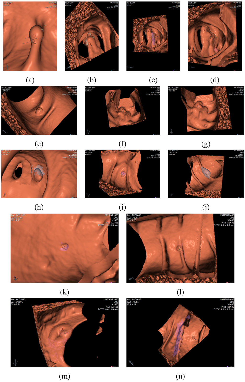 Figure 9 gives visual examples of detected polyps (a)-(l) and false positives (m)-(n). The CAD system accurately detects sessile polyps (e.g., (e), (i), (k)) as well as pedunculated polyps ((d), (h)) and polyps on haustral folds ((a), (j), (l)). One common source of false positives is the ileocecal valve (ICV), which is the valve that connects the colon to the small bowel. The ICV often appears as a protruding shape in the colonic lumen and is picked up by the CAD as a false positive, shown in (m). A false positive appearing on a thick haustral fold is shown in (n). Some true positive diminutive polyps (less than 6 mm) may be detected by the CAD, as shown in (k)-(l). These polyps cannot be avoided entirely since the match between the detected region diameter and the actual lesion diameter is not exact in all cases.