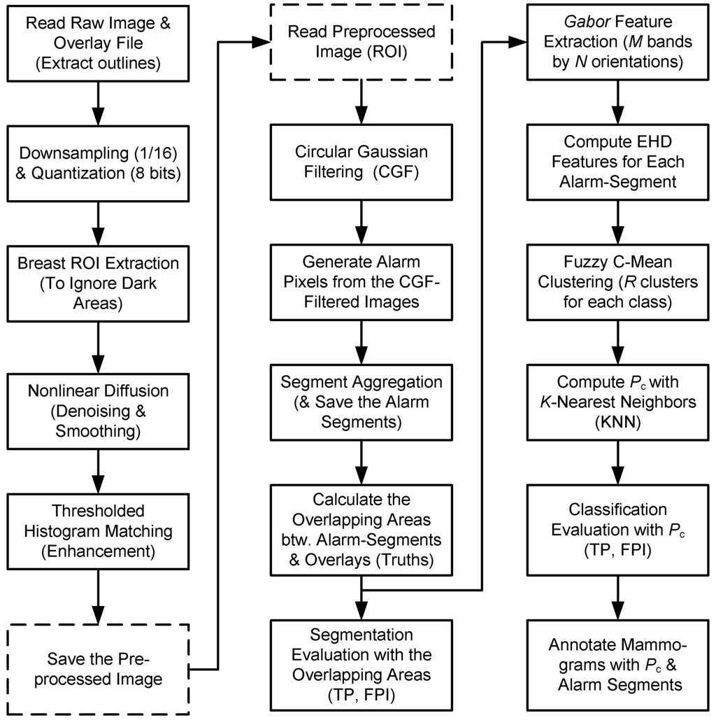 Calcifications are small calcium deposits that form in the breast as a result of benign or malignant processes. Mammographically, they appear as bright white spots of various sizes and shapes. The important characteristics of calcifications are their size, shape or morphology, number, and distribution. Malignant calcifications tend to be numerous, clustered, small, varying in size and shape, angular, irregularly shaped, and branching in orientation [,]. On the other hand, calcifications associated with benign diseases are generally larger, more rounded, smaller in number, more diffusely distributed, and more homogeneous in size and shape. Yu et al. [] used a wavelet filter for the detection of microcalcifications, and a Markov random field (MRF) model to obtain textural features from the neighborhood of every detected calcification. The MRF-based textural features and three statistical textural features (the mean, variance, and a measure of edge density), were used to reject false positives. Soltanian-Zadeh et al. [] compared four groups of features: multi-wavelet-based features, wavelet-based features, Haralick’s texture features [], and shape features. The microcalcifications were first segmented using an automated method, and then the forementioned features were extracted. Within each group, a feature-selection procedure based on genetic algorithms was employed to identify the most-suitable features for use with a k-nearest-neighbor classification scheme. It was observed that the multi-wavelet features yielded the best performance (evaluated with the area under the ROC curve), followed by the shape features, in distinguishing malignant microcalcifications from the benign categories. Bhangale et al. [] and Rogova et al. [] used a set of Gabor filters to process mammograms. By changing the center frequencies of Gabor filters, this method could transform the original images into different scales and orientation spaces. The filtered images are divided into small nonoverlapping blocks. For each block, the mean and standard deviation of the intensities are calculated and a feature vector is formed. Bhangale et al. [] used a k-mean clustering classifier to reduce false positives.