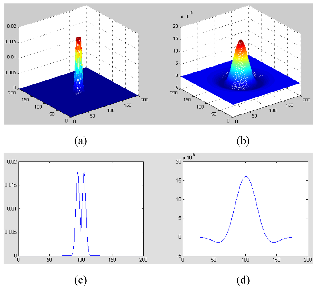 Figure illustration of CGF with f = 12 and σ = 6 (Only the central part of CGF is presented): (a) CGF in frequency domain; (b) CGF in spatial domain; (c) A central slice of (a); (d) A central slice of (b).