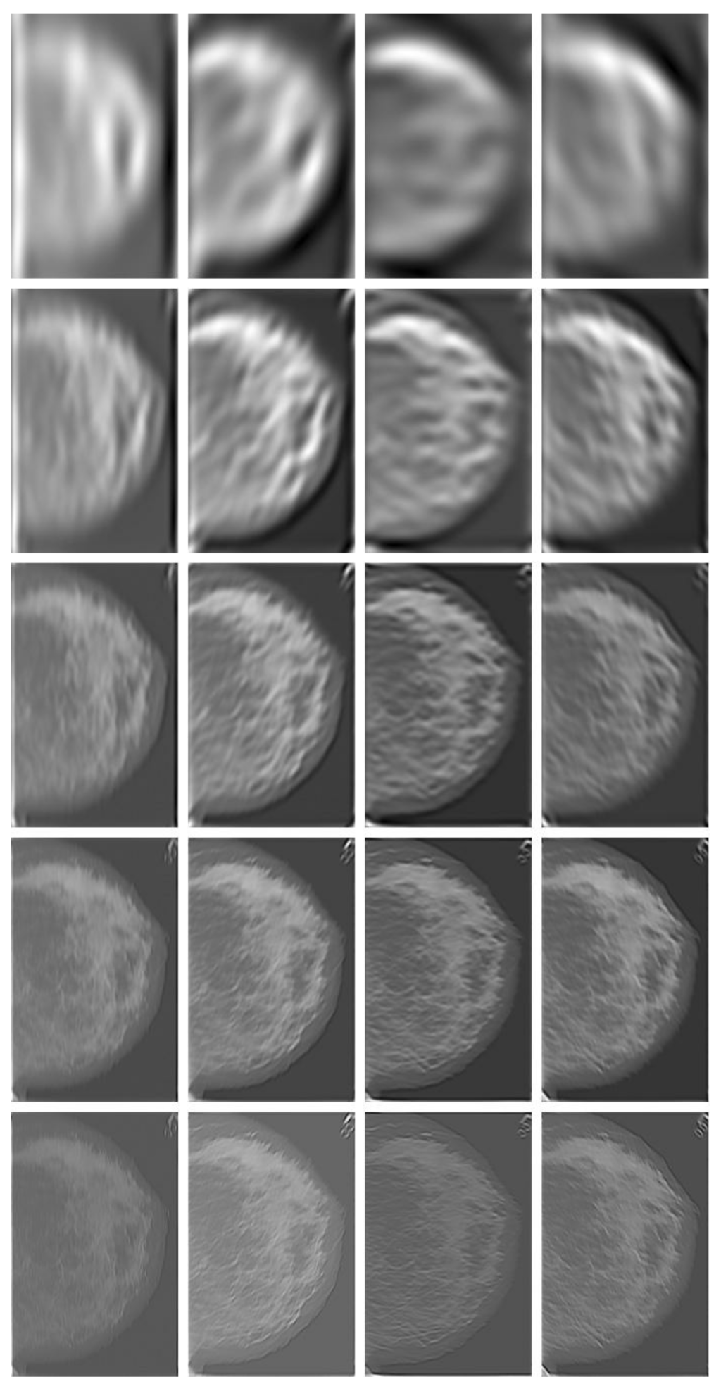 Gabor-filtered images (IGmn, Case “3039_Left” in Figure 10, calcification present) with Gabor filter bank at five bands (along five rows) and four orientations (across four columns) for calcification detection. The four columns were Gabor filtered images corresponding to four orientations (vertical, 45°, horizontal and 135°).