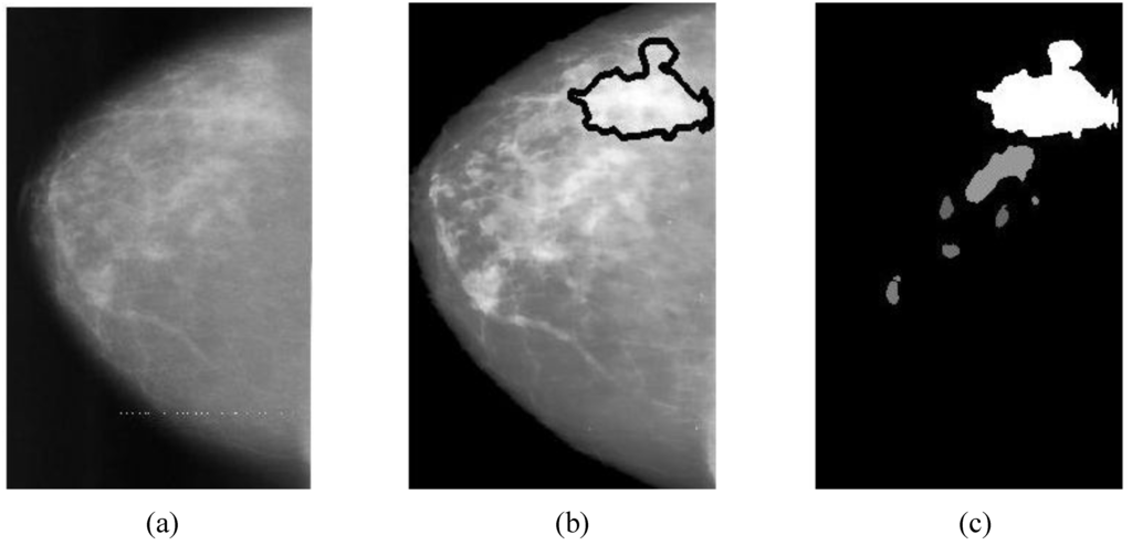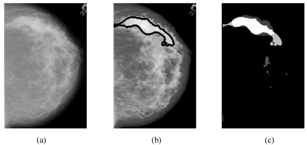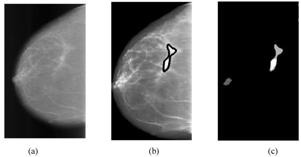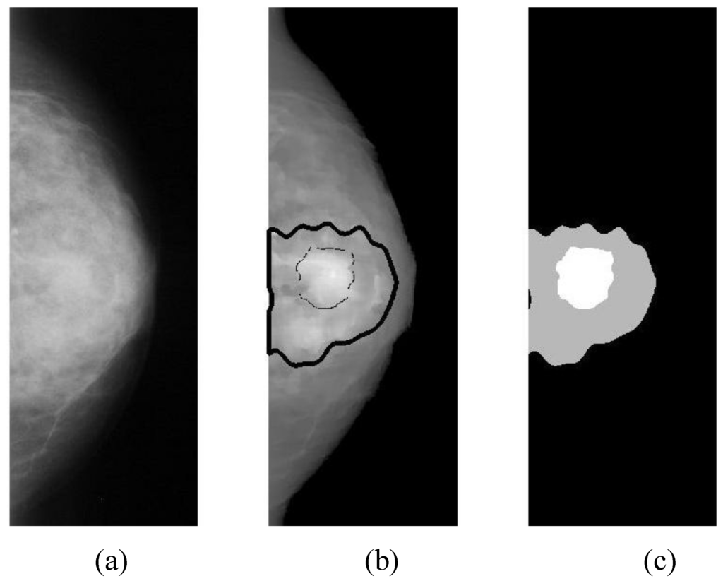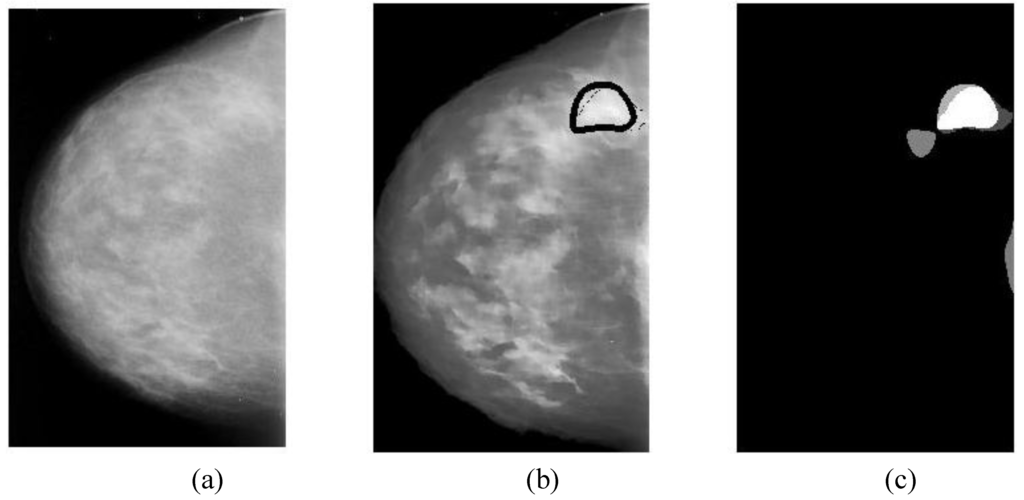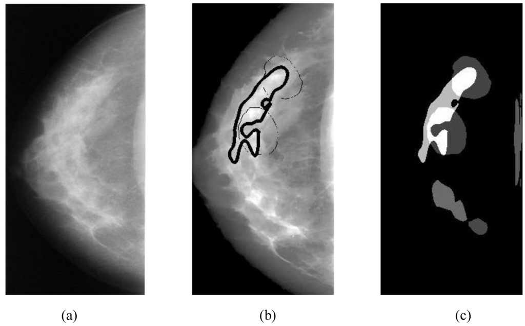 GCD results of Case “3396_Right” (one malignant mass lesion with irregular-shape and spiculated margin, assessment = 4, subtlety = 3): (a) Original mammogram; (b) Preprocessed image with two annotations (PC = 0.63, detected by GCD, in heavy black outlines) and one overlay (ground truths, in light black lines)—one false alarm (PC = 0.50) was annotated; (c) 2 alarm segments (PC = 0.63, 0.50) overlapped on one overlay.