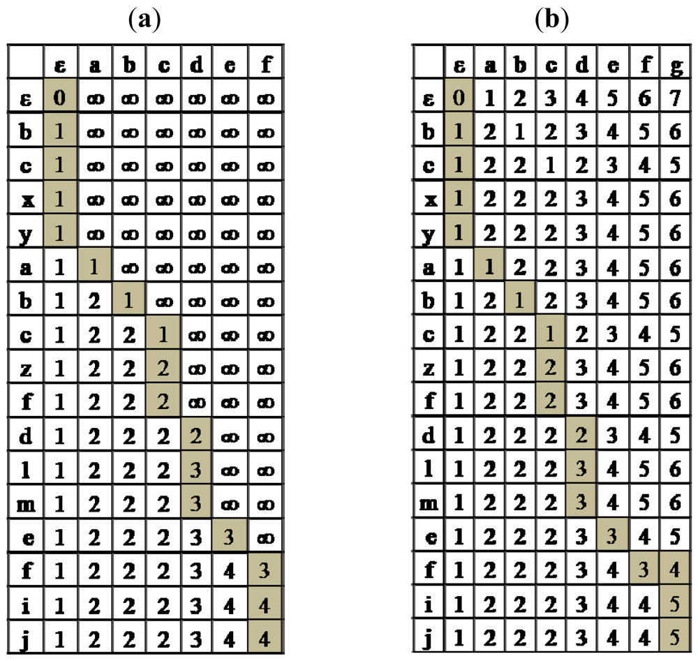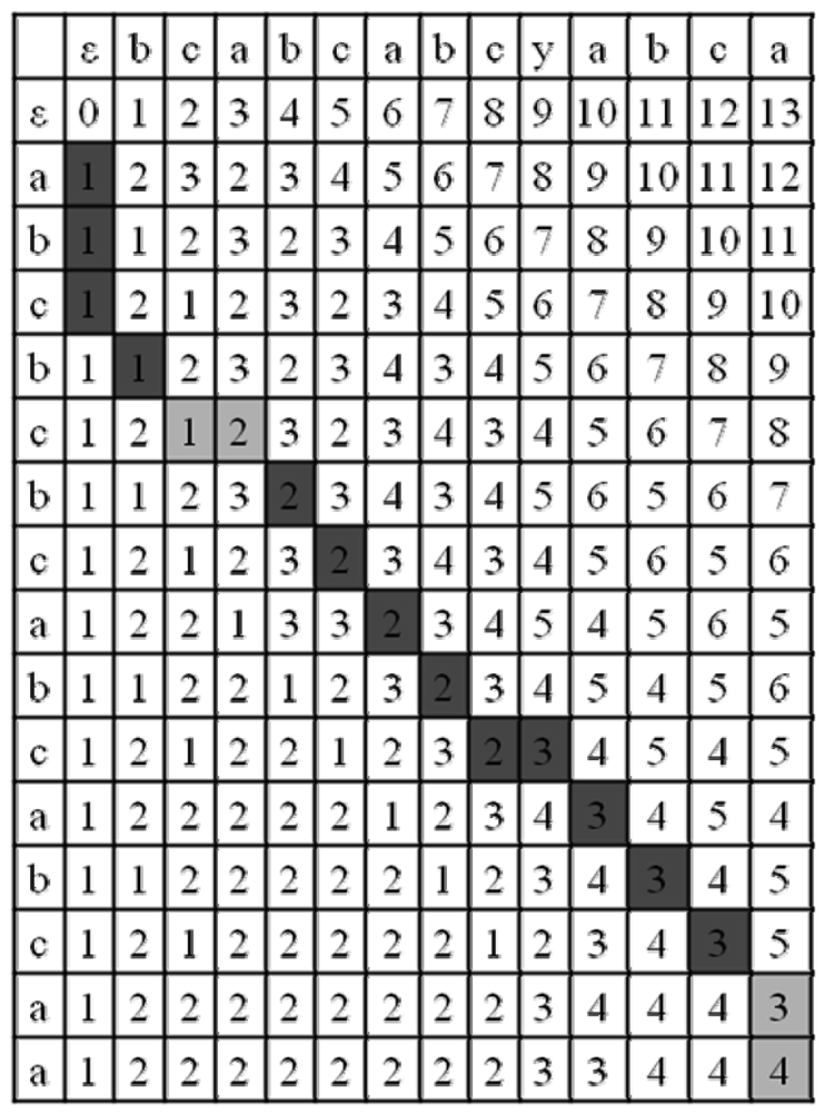 Figure 2 presents the dynamic table constructed, after applying the algorithm of Algorithm 4 of edit distance with unit cost operations (insert, delete, and move) on the strings S = abcbcbcabcabcaa and T = bcabcabcyabca. The light and dark gray cells represent an optimal path. The light gray cells represent an insert (vertical) and a delete (horizontal) of a character a, so the final cost for the edit distance including character moves is 4, which is block deletion of abc, character insertion of a, character insertion of y and a character deletion of a, reducing the cost to 3. The character insert and character delete can be replaced by a character move of a. Notice that another more expensive option is replacing the insert character of a and shortening the block deletion to only delete bc by a move operation of a, but it is not optimal.
