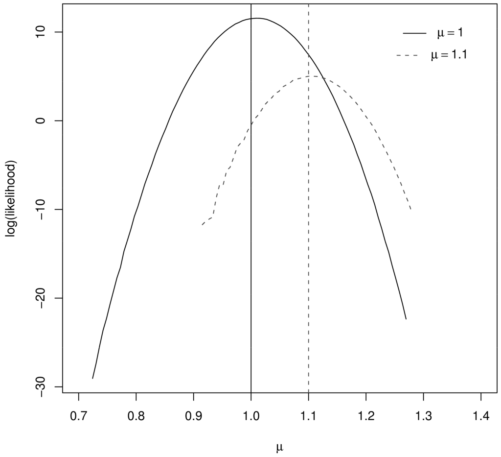 Figure 1 illustrates the resulting log likelihood for μ = 1, μ = 1.1, n1 = 10, and n2 = 1000. Notice that the log likelihood peaks very near the true μ value in both cases.