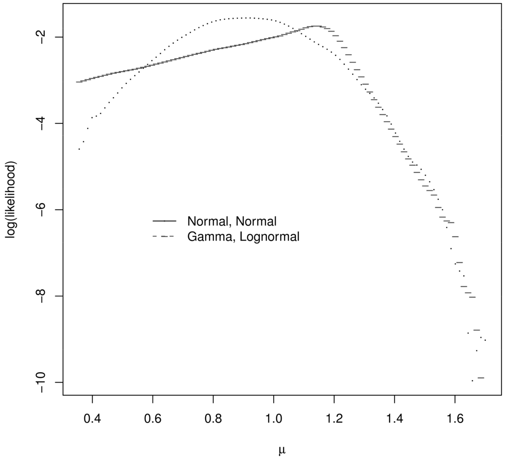 Assume ∊R1 and ∊R2 each have a centered and scaled lognormal distribution and ∊S has a centered and scaled gamma distribution, with parameters chosen so that the covariance matrix Σ of y1, y2 is given by Equation 1. Figure 2 plots the log likelihood for μ values in the μ grid for the correct (true) likelihood for y1, y2 and assuming a bivariate normal distribution for y1, y2. These log likelihoods are meaningfully different and one might expect the corresponding estimators to behave quite differently. For the single realization of y1, y2 = 1.08, 1.24, for which Figure 2 was generated, the GLS and ABC estimate assuming a bivariate normal distribution for y1, y2 is 1.27. The ABC estimate assuming the correct bivariate distribution for y1, y2 is 1.03.