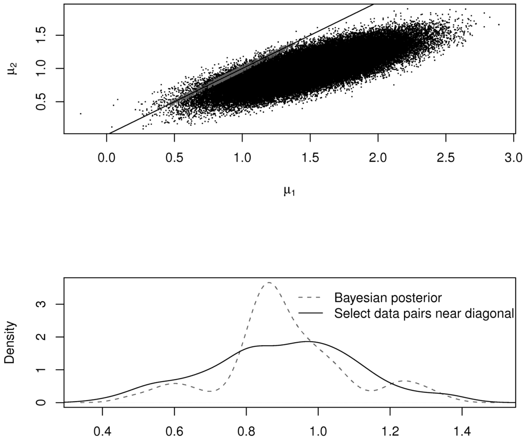 To summarize this section, the ad hoc approach in [8] regards simulated (y1, y2) pairs from any distribution as providing an estimate of μ by specifying a small ∊ and computing the mean of all scalar-valued y1 and y2 satisfying |y1 − y2| < ∊ (or by finding the value of μ that maximizes the likelihood of the scalar data that arise from concatenating all y1 and y2 values that are similar). This approach has a corresponding formally correct Bayesian interpretation, but is easier to implement than the corresponding correct Bayesian implementation with a particular choice of the prior pdf.