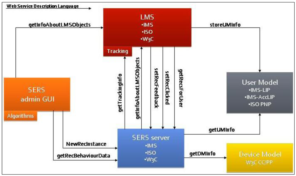Figure1 presents the operation flow among the components involved in the process of delivering the recommendations. It shows the web services (WSDL based) exchanged that relate to the recommendation process. In order to produce the required functionality, SERS can interact with other components such as the user model (UM), the device model (DM) and the LMS. The UM is in charge of collecting the information about the learner to support the personalization process, which can be described in terms of IMS-LIP, IMS-AfA (in particular the subpart that deals with the Accessibility for LIP–AccLIP) and ISO/IEC 24751 (in particular, the subpart that deals with the Personal Needs and Preferences–PNP). The DM stores the information about the device that the learner is using to select the recommendations. For this, the W3C CC/PP specification can be considered.