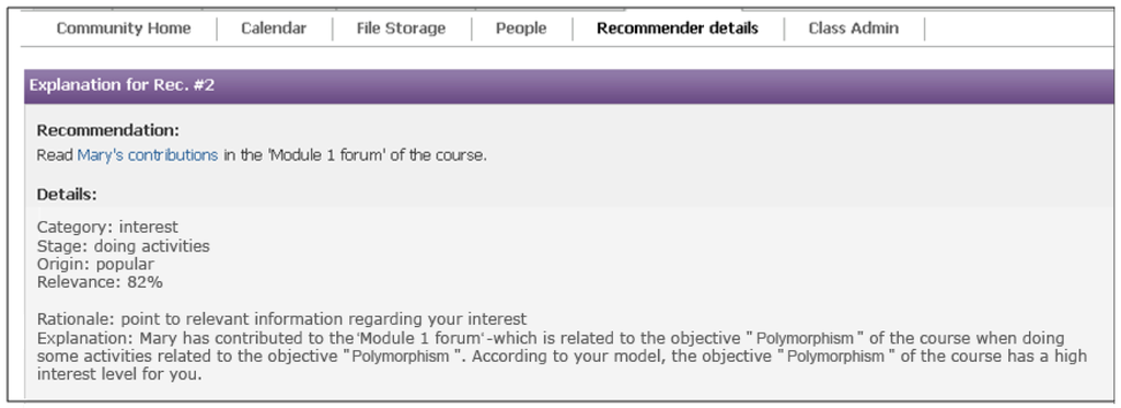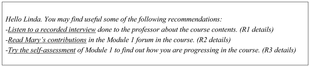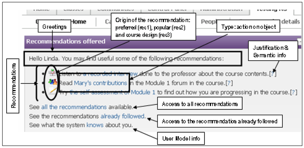 Taking into account the recommendation model, a proposal to present a recommendation list in the LMS GUI was done in [41] and is reproduced in Figure 3. In the figure, the following elements can be identified: (i) the greetings; (ii) the recommendations (in this case, there are three recommendations in the list); (iii) the action suggested on the LMS object (in this case, it is highlighted the recommendation 2, which suggests the learner to read a message posted in the forum by Mary); (iv) the origin of the recommendation, where each origin is identified by a different icon at the start of the recommendation sentence; and (v) the justification and semantic information which is linked to another page that shows this information in detail.