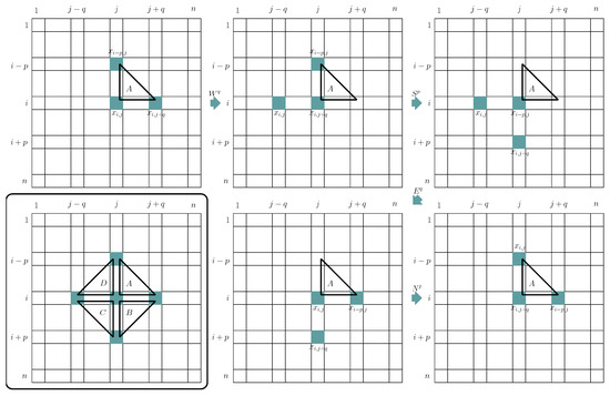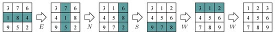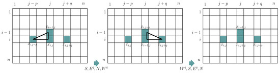 That is, only the part of the ith row is changed (rotated) into . We will refer to this change as three elements rotation on (, p, q, west) (the east version can be defined similarly). Specially, we denote the three elements rotation on (, 1, 1, west) by (the corresponding east version is denoted by ). For example, results in .