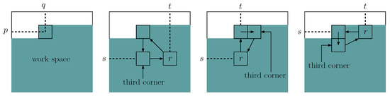 We are now ready to demonstrate our solution. Let be the initial configuration. We first show how to obtain a configuration from any configuration such that for , , i.e., achieves the initial configuration except for the bottom row. Suppose that the pieces numbered 1, , are already at their right positions. Let p and q be the integers such that and . We now wish to have a configuration in which the pieces numbered 1, , r are at their right positions. Let be the position of the piece numbered r in the current configuration. We will refer to the outside of the region placed the pieces numbered 1, , as work space. By proper choice of a third corner (from work space) and executing a proper triangle rotation on the three corners , , and , we can have the desired configuration. Note that, because of the work space, we can take a third corner properly (see Figure 4).