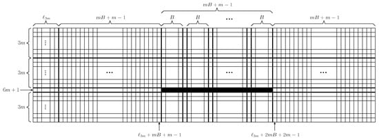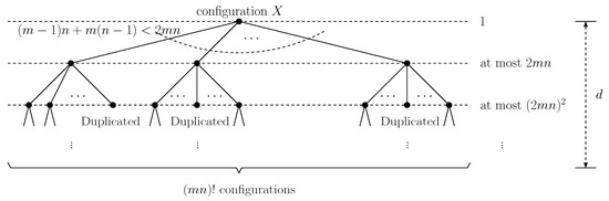 We now show the second statement. Let us consider first the case where is even. Note that . For a configuration in , let denote the set of configurations obtained from by executing one row or column operation (namely, can be obtained from by applying for and some integer k). Let . Since is at most , is at most (see Figure 5). Hence, as , holds. Since , it follows that . This completes the proof of the even case for the second statement.