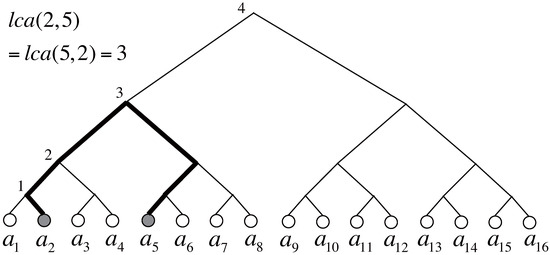 Let p be a positive integer and . The index tree is the rooted, ordered complete binary tree whose leaves are labeled with from the left. The height of a node v refers to the number of edges in the longest path from v to a descendant of v. Then, the height of the lowest common ancestor of leaves is denoted by (We can get the for any leaves i and j of (virtual) complete binary tree in time/space under RAM model [28].) for short.