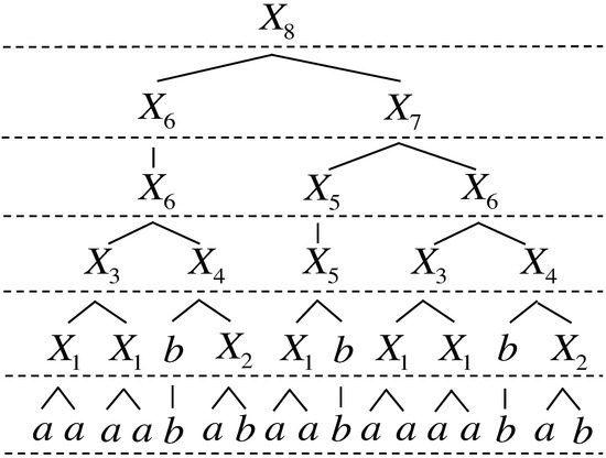 In the case of offline compression, it is easy to generate a grammar by the replacement rules. After we replace pairs in a input string w, we recursively continue this process for a new string produced by replacing pairs until the replaced string becomes only one symbol as shown in Figure 3. We note the height of a parse tree is bounded by , where , because the algorithm replace at least one of or . In the next subsection, we will apply the basic idea to the online algorithm.