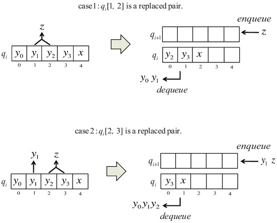 Next we outline the online algorithm. We describe the online version of LCA in Algorithm 2 as well as its recursive function in Algorithm 3. All queues are initialized to contain only dummy symbol , which is required to compute the first pair at the each queue. In the lines 2–5 of Algorithm 2, input characters are enqueued to one by one. In Algorithm 3, if there is such that , the algorithm decides the replaced pair in . In case is replaced by an appropriate nonterminal z, is dequeued and z is enqueued to . In case is replaced by z, is dequeued and is enqueued to . The symbol in the first case and in the second case are remaining in to determine the next replaced pair after a new symbol is enqueued to . Figure 4 describes the action of the function . The algorithm recursively continues the above process until all input characters are enqueued. As the post-processing, the symbols remaining in the queues are replaced by appropriate nonterminals in the left to right order. Finally the produced dictionary is returned.