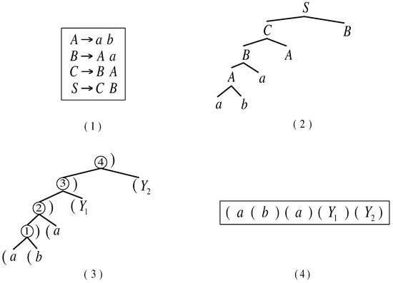 The example of the encoding process for CFG : (1) the dictionary ; (2) the partial parse tree ; (3) the parentheses representation of the tree and renamed labels where ; and (4) the encoded representation of G.