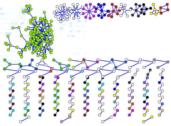 - Batagelj, V.; Zaversnik, M. An O(m) Algorithm for Cores Decomposition of Networks; Technical Report 798; Institute of Mathematics, Physics and Mechanics (IMFM): Ljubliana, Slovenia, 2002. [Google Scholar]