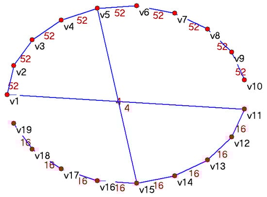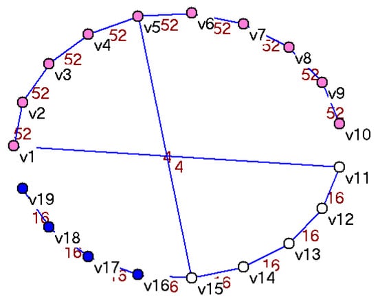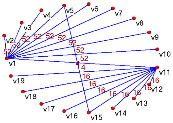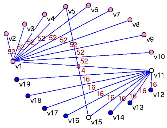 Given the 19 files with the content shown in Table 1 we can build an SCSGgraph as follows: each file is represented by a vertex, so we have {} vertices in our graph. Edges represent sharing of content between vertices and to have a minimum number of edges in the graph, we represent the shared content only once. Each edge has a weight representing the number of bytes shared by connected vertices. Representing the shared content only once provides another important property of the SCSGgraphs: the deduplicated size of the folder (file system) is simply the sum of vertex (raw file) sizes minus the sum of connecting edge weights. In Table 1 we see that file #1 to file #10 share chunks 2 to 14 (that is 13 chunks × 4 bytes = 52 bytes), and file #11 to file #19 share chunks 2 to 5 (20 bytes). One way to build an SCSGgraph with vertices {} is to connect with each vertex to by edges of weight 52 bytes, then to connect with each vertex to by edges of weight 20 bytes and finally to make explicit the sharing of the “brown” (last chunks in files #1 and #11) and “yellow” chunks (last chunks in files #5 and #15) by edges of weight 4 bytes. We get the SCSGgraph shown in Figure 2. We name this connection topology a STAR because from the n vertices sharing the same content we selected one (center of the star) to be connected with each other. The SCSGgraph for a folder on a Windows XP laptop shown in Figure 1 uses the STAR connection topology.