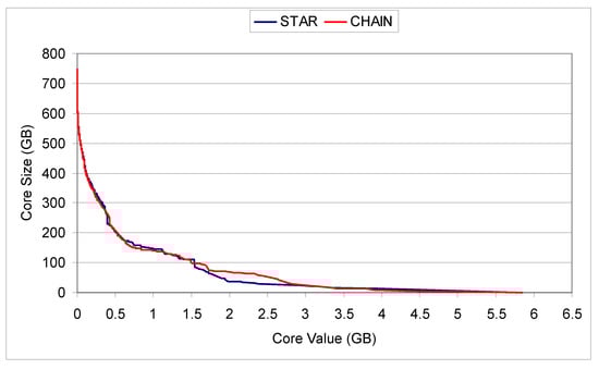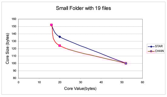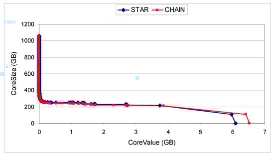 The k-cores and their (deduplicated) size for the set of 19 files in Table 1 using CHAIN and STAR topology. There are three k-cores for each connection topology: the top core (value “52”) with (deduplicated) size of 100 bytes, the middle core (value “20”) with size of 124 bytes for CHAIN connectivity and 136 bytes for STAR, and the lower core (value “16”) with size 152 for both connection topologies.