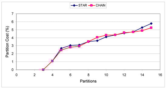 Partitioning cost as function of the number of equal sizes partitions, for WL1 workload using CHAIN and STAR topology.
