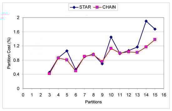 Partitioning cost as function of the number of equal sizes partitions, for WL2 workload using CHAIN and STAR topology.