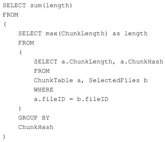 . In the third step, unique chunks in are found by an SQL GROUP BY operation. In the final step, the total size of unique chunks are computed by an SQL SUM operation. All queries in these 4 steps are optimized properly. For example, in step 2, the table has a cluster index on the field so that the SQL JOIN operation is efficient. The SQL query for these 4 steps are shown in Figure 12.