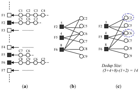 Figure 13 show an example of the Graph algorithm. Initially, each file has a mapping to all its chunks. Each file has its own file size. Each chunk size is 1 so that the edge weight is 1. Chunk identifiers are the result of deduplication so that 2 files can map to the same chunk identifier. For example, appears in file , and . If , and are chosen as the subset of files, in Step 1, these 3 files and its chunks form a B-Graph, , and have their file sizes as 5, 4 and 8, respectively. In Step 2, all chunks are traversed to find out those chunks with more than 1 edge, and are chosen. The accurate deduplicated size of the subset is .