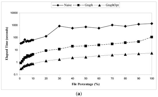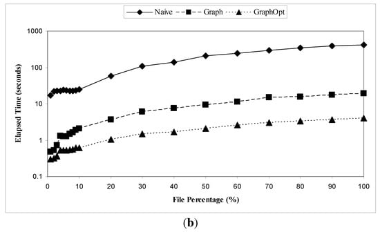 Figure 14(a) and Figure 14(b) show the results of all three algorithms. We can draw two conclusions from the results. First, graph-based algorithms are at least one order of magnitude better than the Naive algorithm with respect to elapsed time. In particular, GraphOpt can achieve the elapsed time less than 1% of what can be achieved from the Naive algorithm. For example, for WL1, when the file percentage is 50%, the elapsed time of Naive is 744 s, the elapsed time of Graph is 21 s, and that of GraphOpt is 2.6 s. Second, GraphOpt is more scalable than Graph. For example, when the file percentage is 10%, both algorithms have an elapsed time less than 5 s. But when the percentage of files is 50%, the Graph algorithm has an elapsed time of 21 s, while the GraphOpt has an elapsed time of 2.6 s.