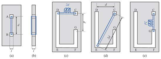 Consider the board of Figure 1(c). This is a board with hole C and corridor connecting D to G through E and F. The distances from C to D and from C to G are both d, and the distance from C to E is . Suppose the looped string goes through C and D, and the length of the string is . The coil-like portion labeled with in Figure 1(c) represents string slack.