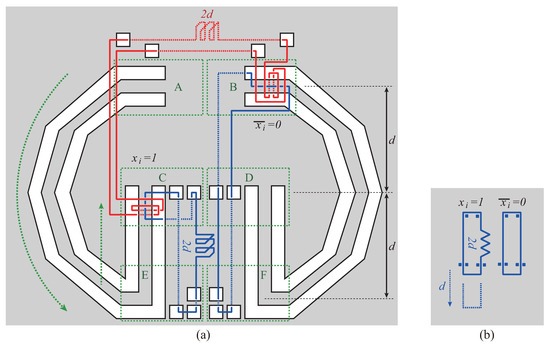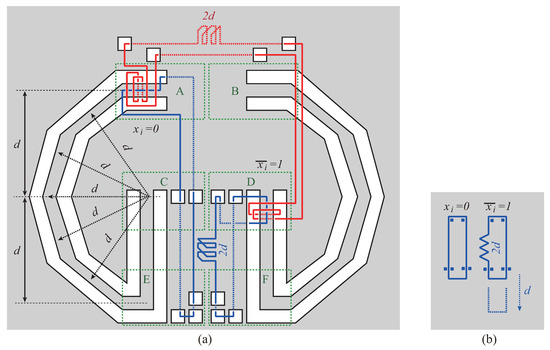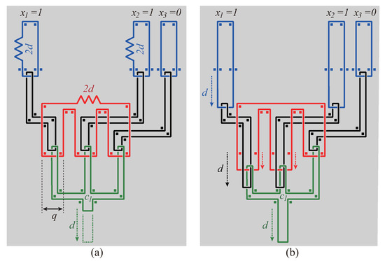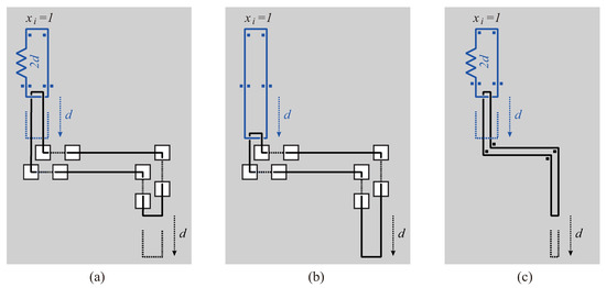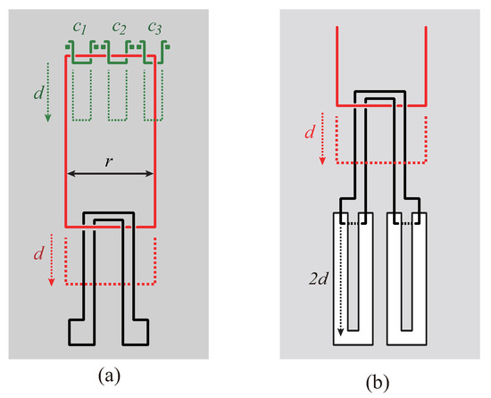 In Figure 7(a), the value of r is negligibly small from the same reason as the value q in Figure 6(a). In Figure 7(b), the height of each U-shaped corridor is , and the width is negligibly small as compared with the height. The construction of the conjunction gadget can be done in polynomial time from the reason similar to disjunction gadgets.