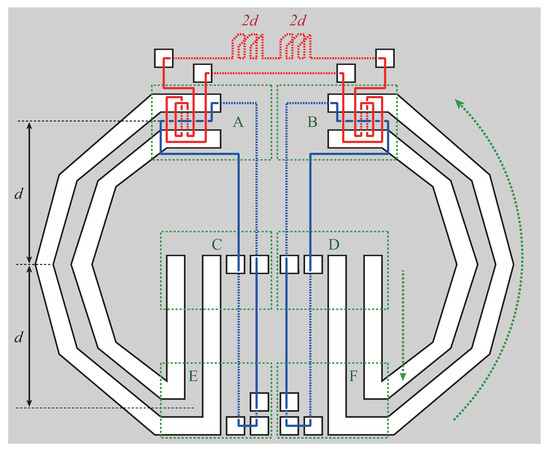 In Figure 2(a), there are two blue strings and a red string. Each blue string goes through holes and corridors six times, and the red string goes through holes and corridors 12 times. The red string twines around each blue string (see green quadrilateral areas A and D). We assume that the six areas A through F are negligibly small compared with the value of d. (In the figure, distance d is not so long due to space limitation. However, one can see that constructing the gadget of Figure 2(a) for a sufficiently large d is not difficult.)