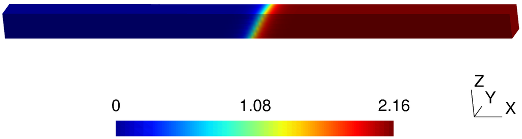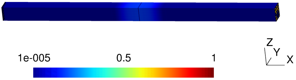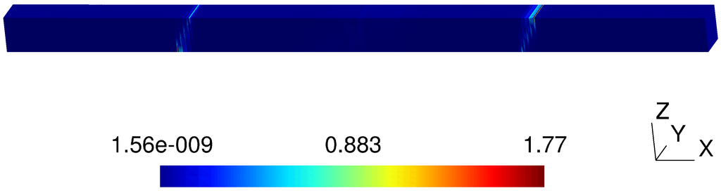 Table 4. Error for increasing ρ, fixed h = L / 749 corresponding to the 749 × 5 × 5 mesh, inclination of the vertical discontinuity α = 0 ; the support width is ρ = 20 ρ .