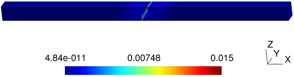 The same analysis is repeated for one case of inclined interface, namely α = 30 . The corresponding results are reported in Table 5 and Table 6. In Table 5, the mesh of 255 elements along the length was refined in the cross section in order to reduce mesh distortion [28]. In particular, in Table 6, the influence on the numerical error of the support width is illustrated. While here, unlike in the case α = 0 , the support width ρ = 20 ρ leads to non-satisfying results, the minimal error obtained by adopting a support ρ = 40 ρ is of the order 10 3 , while the quality of the convergence is non-satisfying as oscillates. Conversely, adoption of ρ = 60 ρ improves convergence. Note that in Table 5 and Table 6, a smaller value of the ratio ρ / h is used than in Table 5, because larger ρ may lead to ρ larger than the length L. The map of the stress error in percentage for varying truncated support width are displayed in Figure 5 and Figure 6, corresponding to ρ = 40 ρ and ρ = 60 ρ , respectively. In the former figure, the total error is dominated by the truncation error, because it is localized at the enriched volume boundary. In the latter figure, the truncation error disappears, while the relevant error is localized along the inclined interface. In both figures, the ratio ρ / h = 5 is used. Consequently, the enrichment involves several layers of elements. This reflects the fact that the displacement jump across the discontinuity is smeared over a width larger than the representative element size, as shown in Figure 7.