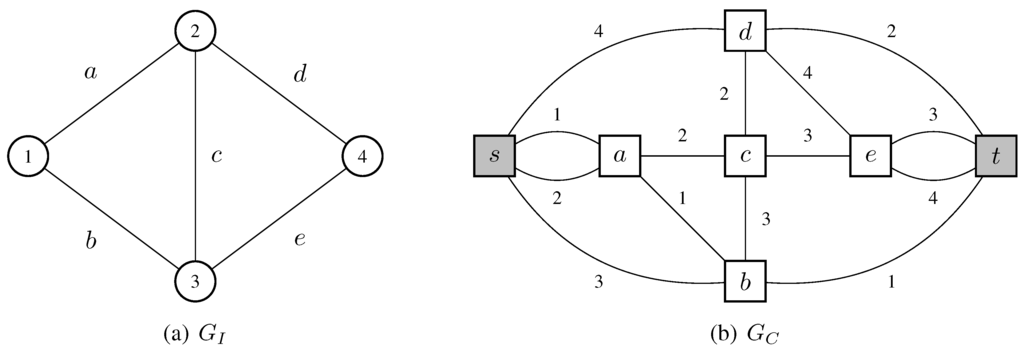 An example of a graph and the edge-colored graph associated with it. For convenience, we labelled the edges of such as they correspond to the vertices in . The colors of the edges in are indicated by numbers placed near the edges, while the two distinguished vertices s and t are highlighted in grey. The order of the edges of is simply the lexicographic order of their labels.