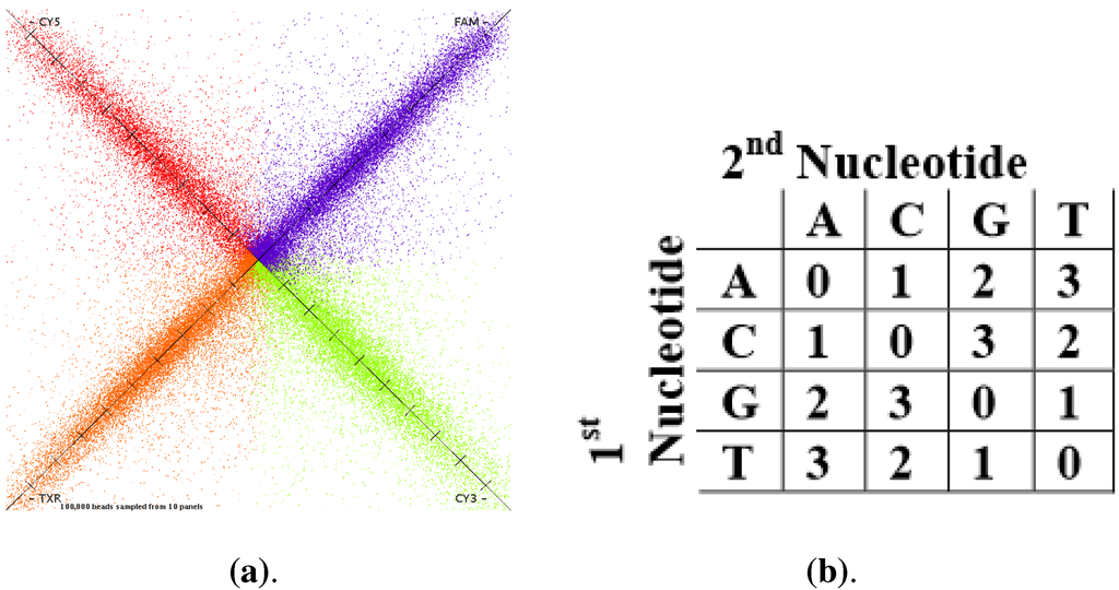 Elements of color-space sequencing. (a) Satay plot; (b) Color space matrix.