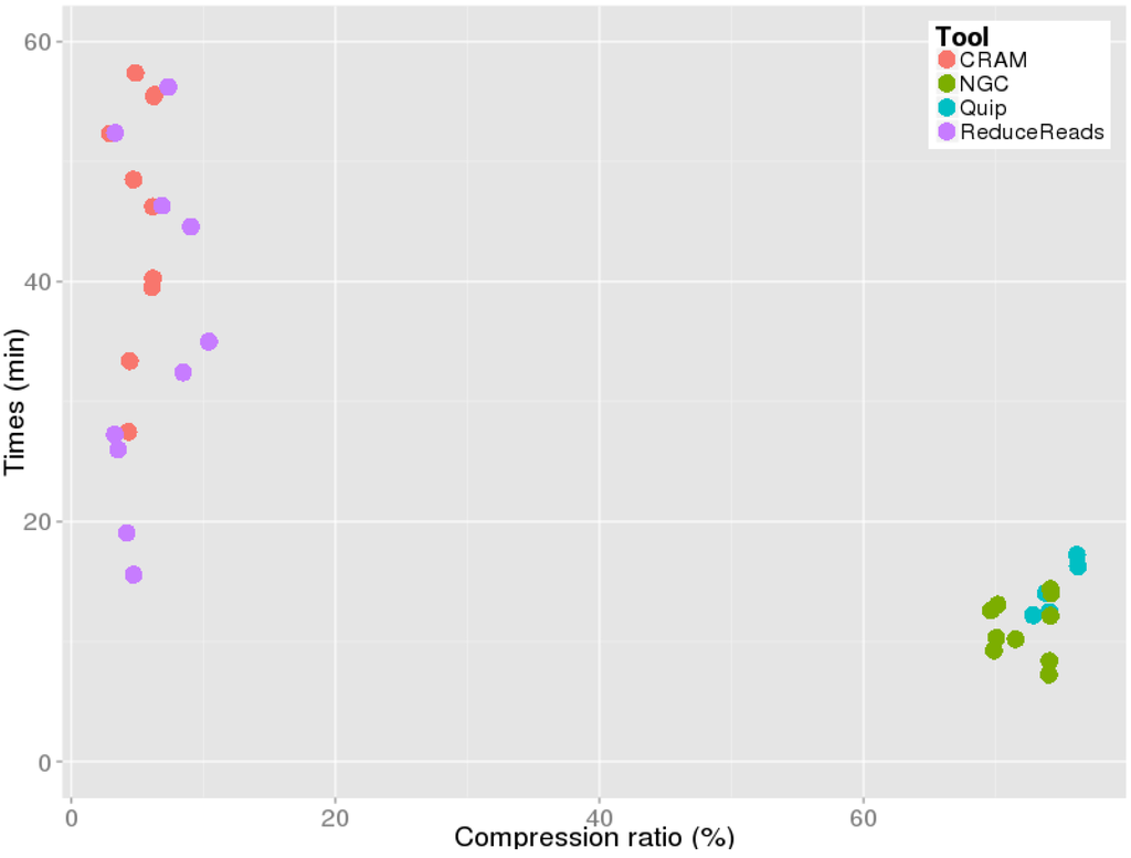 Finally, we have observed the wall clock times and disk occupancy saving provided by each tool. CRAMtools and ReducedReads took from 20 to 60 min to compress the ten original BAM files, whose sizes ranged from to GB. The ratios between uncompressed and compressed files were proportional. NGC and Quip exhibit a more conservative compression policy, with expected reduced running times (see Figure 4). Furthermore, NGC and Quip deliver compressed files with comparable sizes, irrespective of their original sizes.