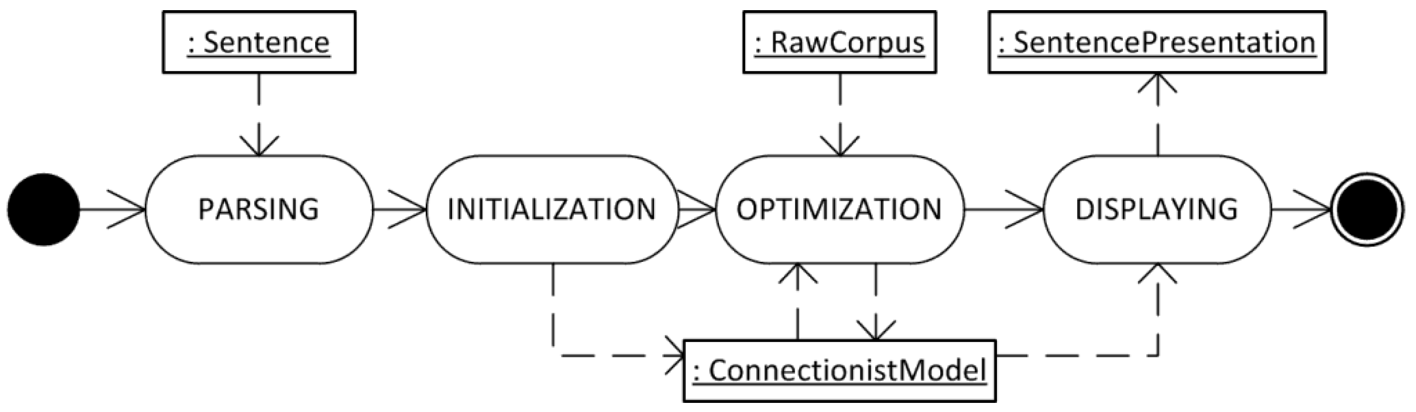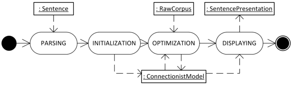 At the beginning, the sentence is parsed and then converted into an initial connectionist model instance. The sentence is completely broken up into (overlapped) segments by a segmentation operator. Afterwards, the connectionist model instance goes through an optimization process, which optimizes the connections by using the usage information available in the raw corpus instance, i.e. the Web. Finally, connectionist model information is displayed, i.e., transferred to a visual representation of the sentence, namely a sentence presentation instance [25,34].
