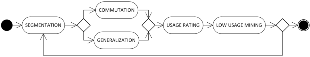 More specifically, Figure 3 shows the macro activities of the optimization process. First, a segmentation of the sentence is performed, producing a series of n-grams of the sentence itself. Then, one of two possible operators is applied, namely generalization or commutation. The former is an operator that employs the class of a specific word in place of the world itself, whereas the latter is an operator which substitutes a word with another more popular word which is structurally similar. Afterwards, the usage of each n-gram in the corpus is rated. Finally, the n-grams with the lowest usage are determined. In order to find the best setting, all these activities may be carried out a number of times, as represented by the loop in the Figure.