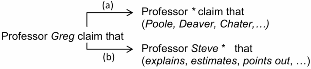 Figure 4a shows an example of generalization, in which the individual name “Greg” is replaced with any other individual name that can be found in the Corpus by using the wildcard. Figure 4b shows an example of commutation, in which the individual name “Greg” is replaced with the more popular name “Steve” and the word “claim” is generalized. Each of these alternatives affects the usage rating of the phrase, and allows a better robustness of the optimization process. For example, without the generalization operator, usage rating may be strained by an unpopular word.