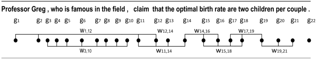 Our system aims at providing a continuous-valued representation of word relationships in a given sentence. Figure 1 shows a sample sentence with some relationships (connections) between words. Here, subsequences of words, i.e., word n-grams, involved in each connection are represented in boldface.