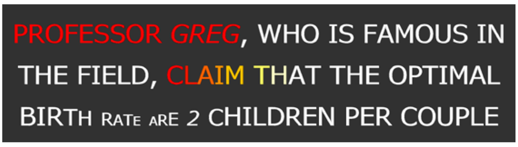 Figure 7 shows an example of visual output, where there are two n-grams with low usage, i.e., “Professor Greg claim that” and “Rate are 2”, non-contiguous and contiguous respectively. Here, it can be also noted that letters of a single word have different sizes and colors, so as to have soft style transitions. Indeed, the size and colors computed by the above formulas are average values for each word, which are linearly spread from a word to another.