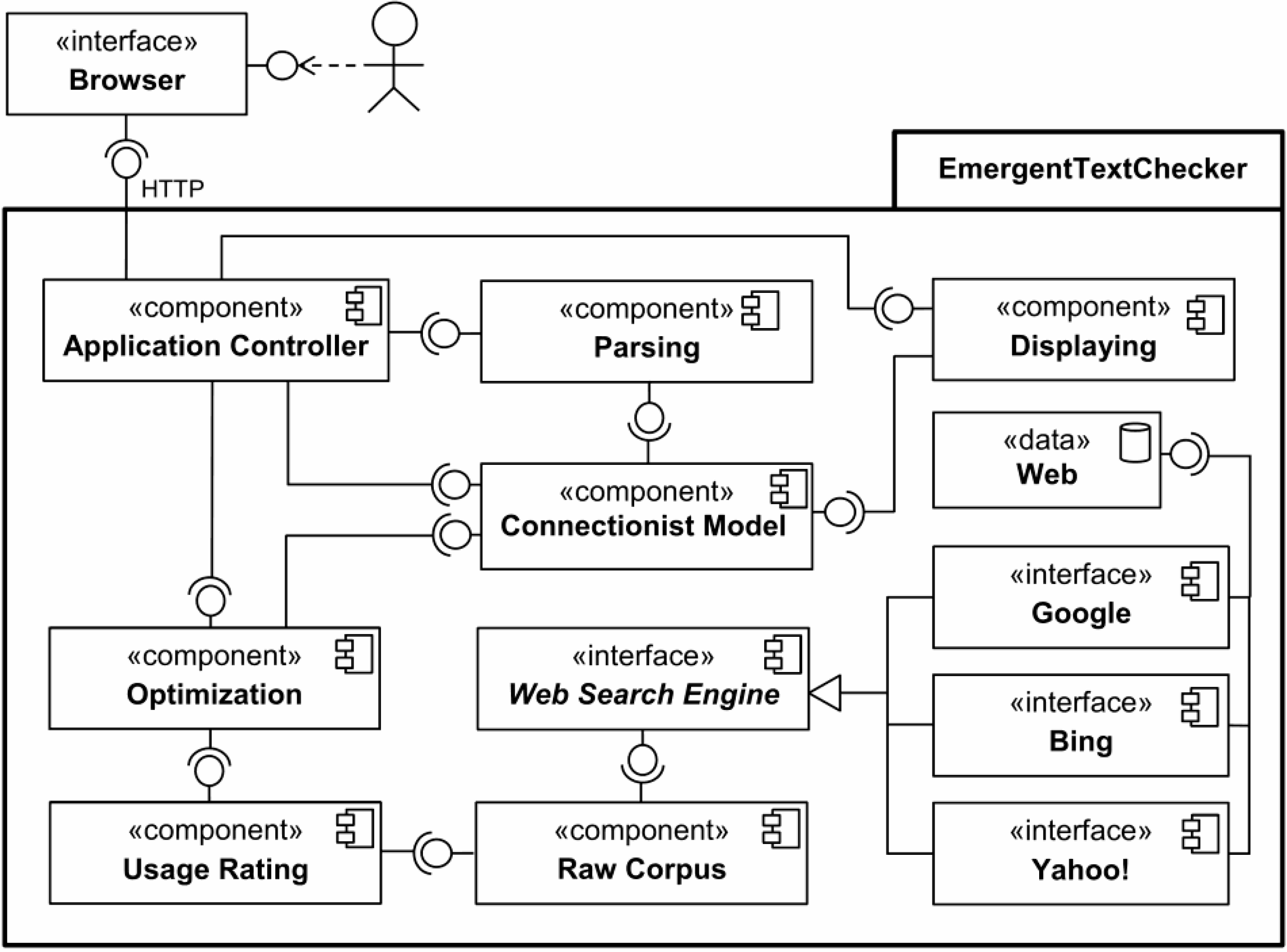 Figure 8 shows how the overall components of the system are wired together, via a UML component diagram. The client-side is made of a web-browser interface. The package Emergent Text Checker contains all the server-side components. On the server-side, an Application Controller component manages all the communications from and to the client-side, as well as triggers the other components. More specifically the main components are the following: (i) the Parsing and Displaying components, which manage the input and the output sentences, respectively; (ii) the Connectionist Model component, which is responsible for managing the connections between words; (iii) the Optimization component, which is able to optimize the Connectionist Model on the basis of the Usage Rating component; (iv) the Raw Corpus component, which can be realized thanks to the use of the Web Search Engine components. The latter can be implemented with many alternatives, i.e., Google, Bing, Yahoo!, or with an aggregation of their results.