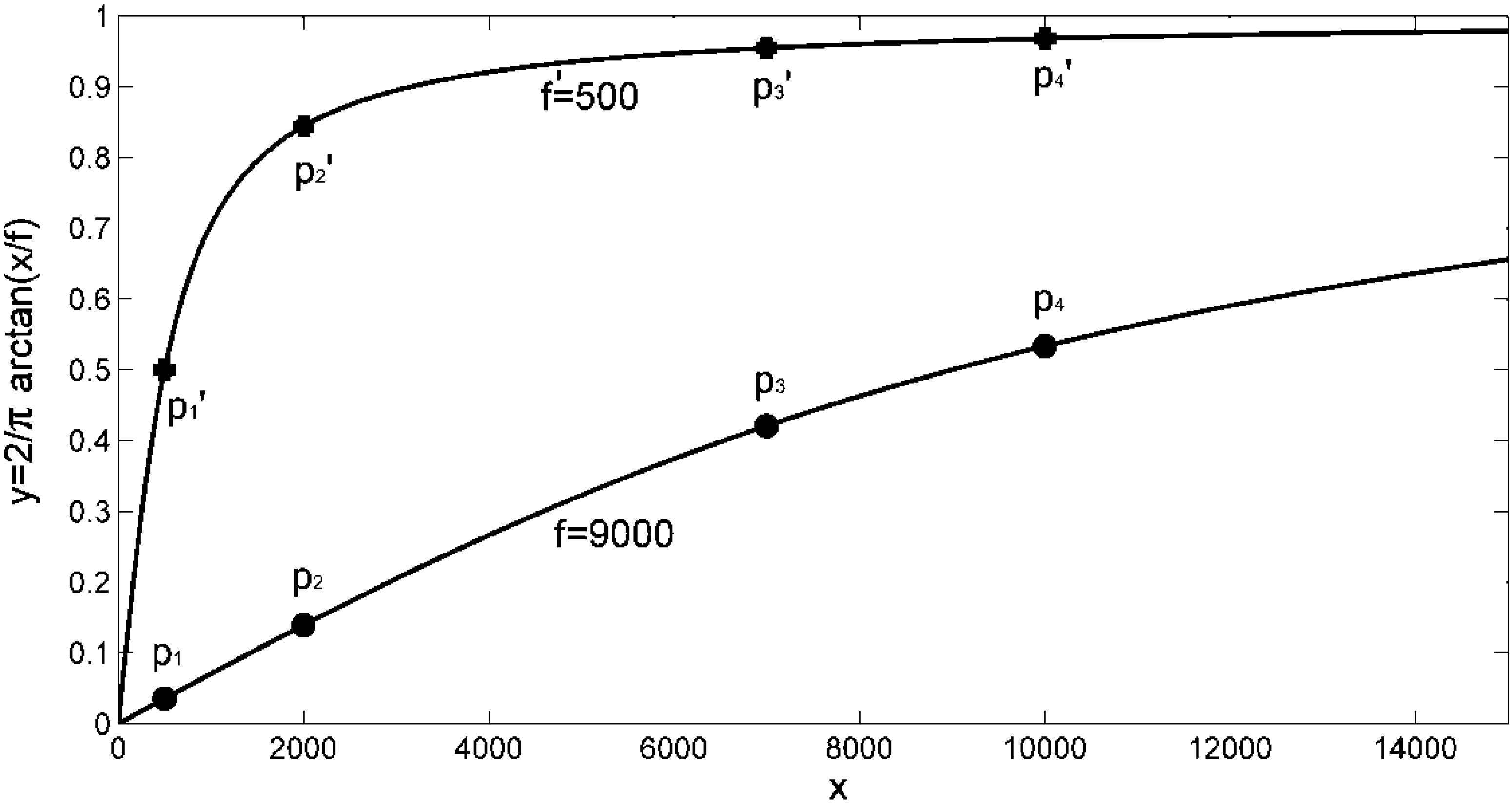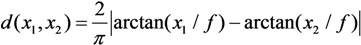 where f is a scaling factor which is automatically adapted. More specifically, Figure 9 shows two simple scenarios of proximity space y = arctan(x/f), corresponding to two different curves with different values of the scaling factor f. On both curves, the same precise usage values are considered, i.e., x1, …, x4. With the lower scaling factor (f' = 500), high usage values are considered very similar in the proximity space, whereas low usage values are considered very dissimilar. However, a very low scaling factor would consider all usage values almost identical and equal to 1 in the proximity space. With the higher scaling factor (f = 9000), usage values in the proximity space y are almost linearly connected with the source space.