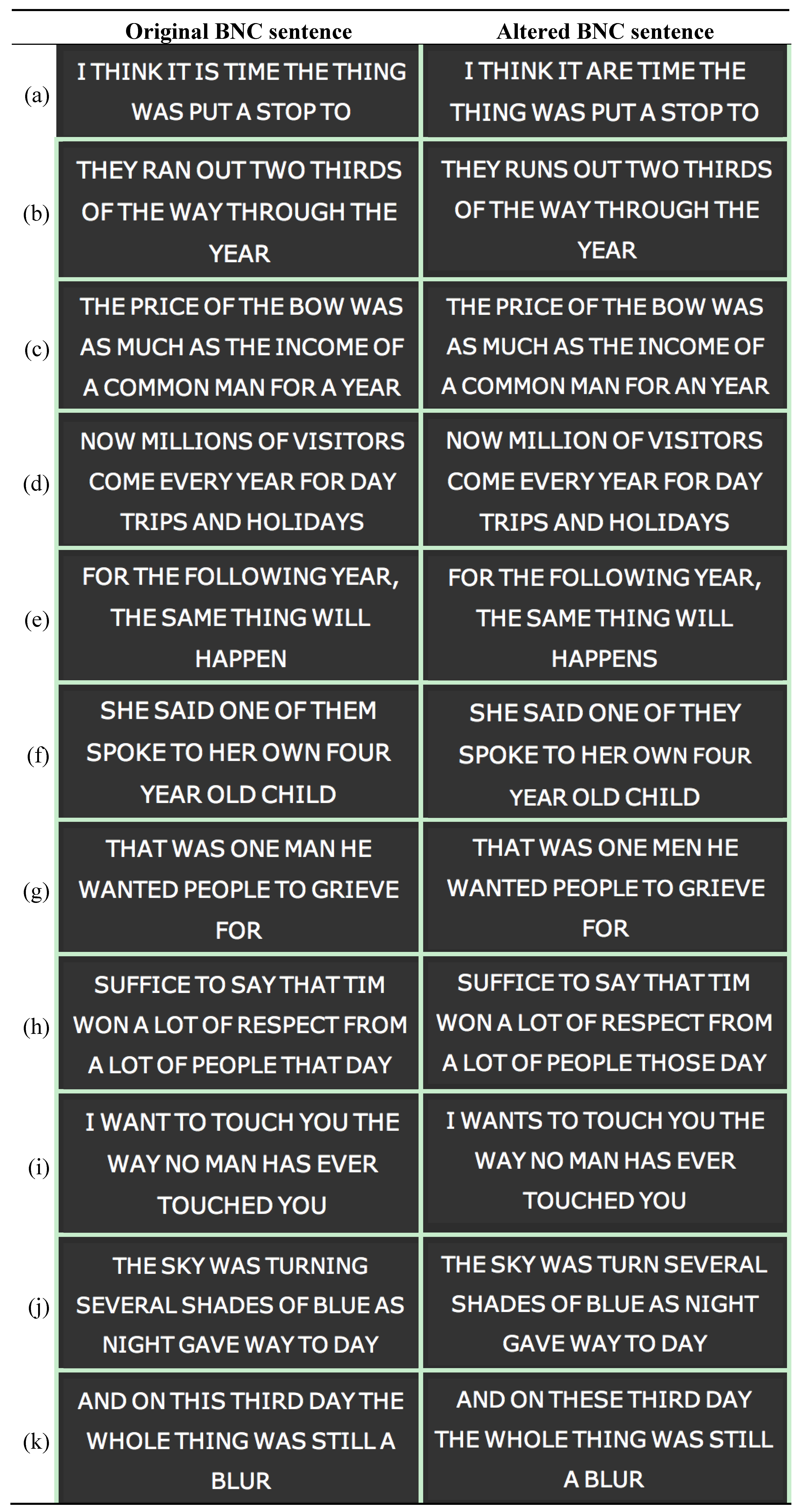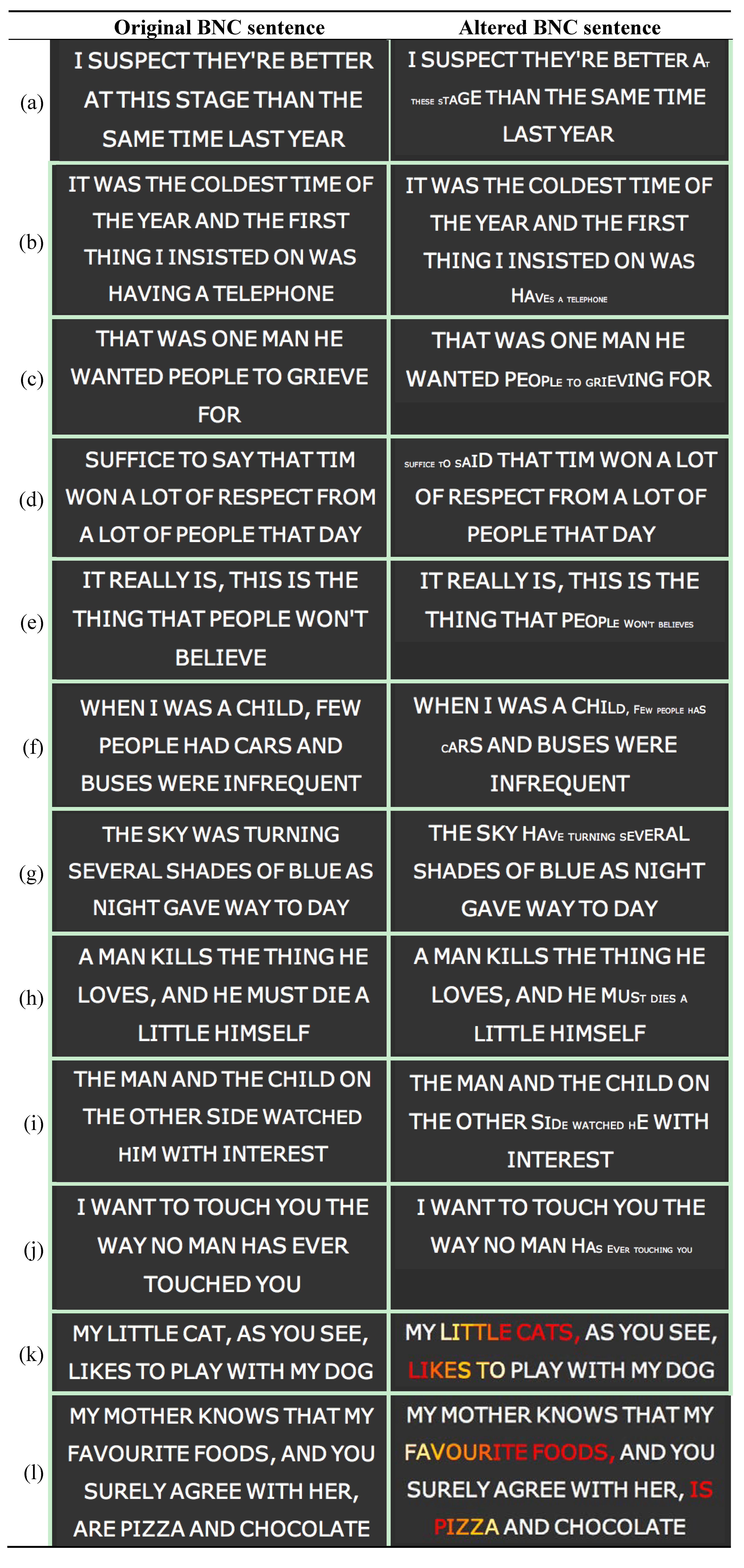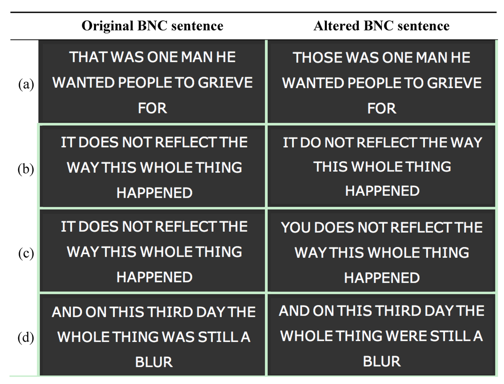 Figure 12 shows some peculiar examples of successful application of our system. Again, on the left side of the figure, original BNC sentences are presented. All these sentences are correct from a grammatical standpoint, and then no atypical subsequences have been detected. Hence, all cases on the left are true negatives. On the right side of the figure, the same sentence of the left side is presented with some grammatical mistake. However, such grammatical mistakes are not considered atypical by the system, in terms of usage. Moreover, it has been verified that, for a given mistake, in all cases found by the system the subsequences with the grammatical mistake have been employed with the same meaning as in the original sentence. Hence, all cases on the right are true negatives.