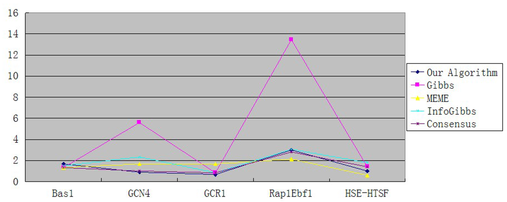 Table 3 shows the results of the five algorithms on biological data sets. Table 4 and Figure 2 give the average mismatch numbers of each algorithm. We choose four well-known motif-detecting softwares to make the comparisons. From Table 3 and Table 4, we see that the average mismatch numbers of our algorithm on data sets GCN4 and GCR1 are significantly lower than other four well-known methods. On the data sets Bas1,Rap1Ebf1 and HSE-HTSF, our algorithms also shows satisfied performance compared to other methods.
