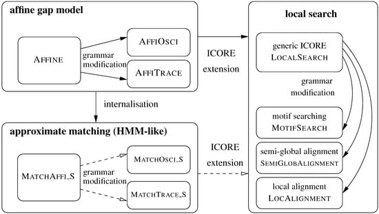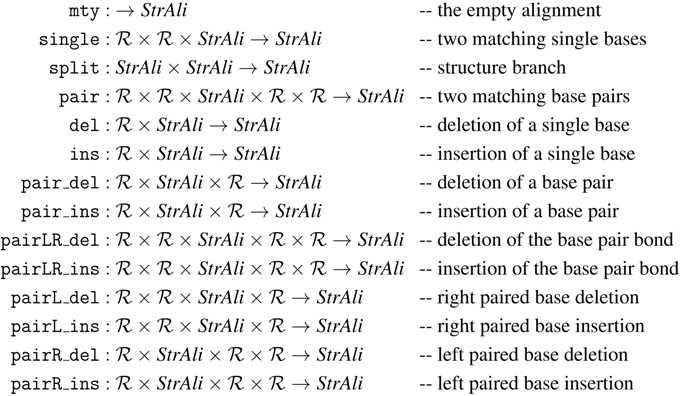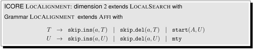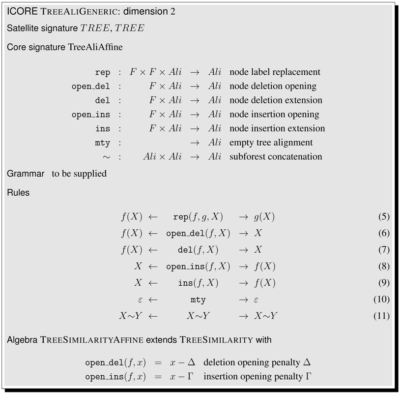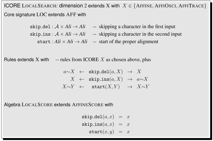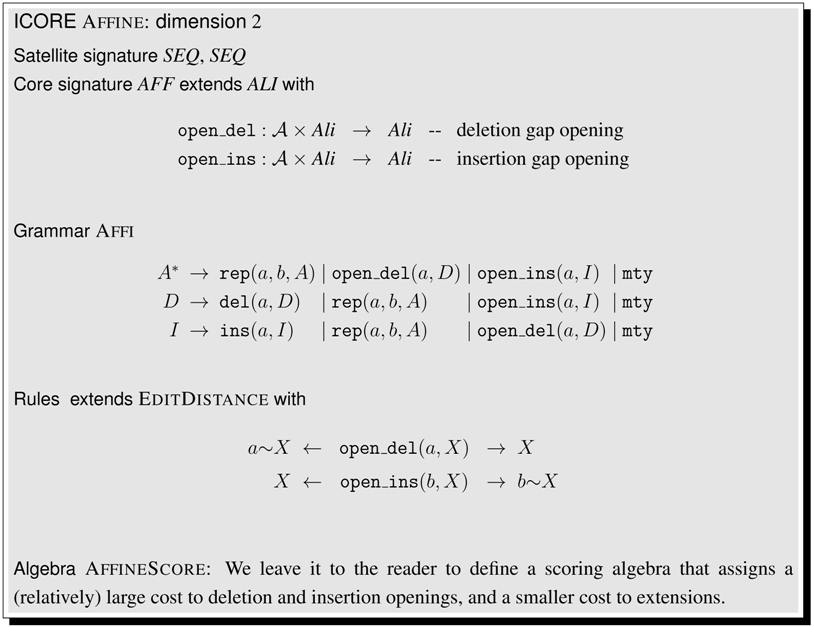 Signatures and terms, rewrite rules and algebras—this may seem a bit of a technical overhead for defining the Levenshtein distance of two strings. However, note that we have achieved a perfect separation of search space definition and scoring. This pays off when it comes to specifying more sophisticated problems. More flexible scoring schemes for the edit distance problem are easily provided. For example, our functions can score in a character-dependent fashion. Similarity scoring can replace distance scores, with positive scores for matches, negative scores for gaps and proper replacements, and switching to . Under a probabilistic scoring algebra, scores should multiply (rather than add up), and we better set . Such variations to the scoring scheme only require a new algebra definition. Other changes affect the signature, and consequently the rewrite rules. We shall see in Section 5 that to introduce affine gap scoring, for example, it is enough to add operators and to the signature.