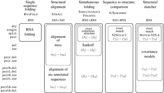 - Sankoff, D. Simultaneous solution of the RNA folding, alignment and protosequence problems. SIAM J. Appl. Math. 1985, 45, 810–825. [Google Scholar] [CrossRef]