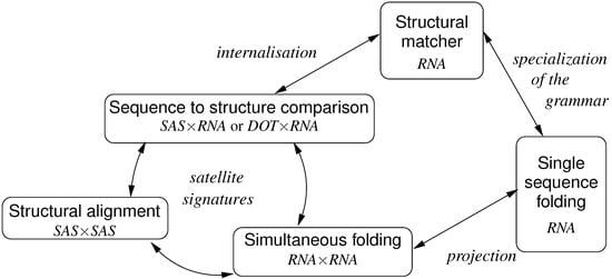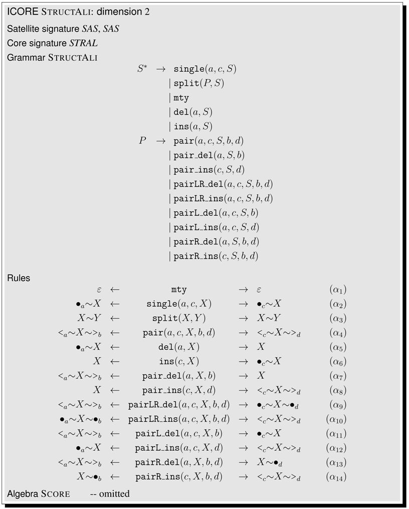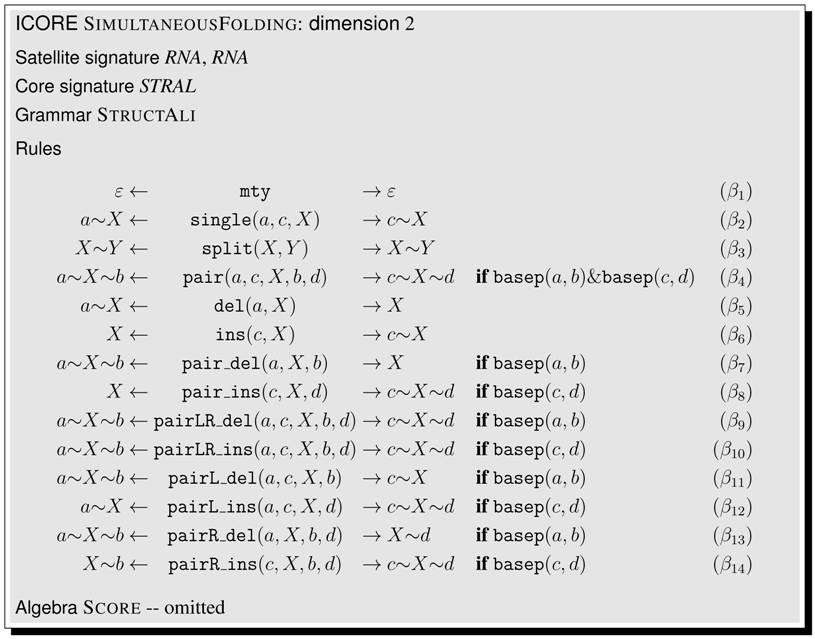 Quite early in the young field of bioinformatics, researchers have advocated general techniques for specifying and implementing such algorithms. In a series of papers, Searls introduced the use of concepts from formal language theory palwith problems in biosequence analysis [,,]. In particular, context free grammars were advocated for molecular pattern matching, and letter transducers were introduced to model problems related to string edit distance of DNA sequences. This work has been very influential in attracting computer scientists to the problems of biosequence analysis, but has not led to competitive implementation techniques. Not much later, Lefebvre advocated the use of s-attributed grammars []. He showed that not only sequence comparison, but also complex problems such as simultaneous alignment and folding of two RNA sequences (introduced above as the Sankoff algorithm []) can be described by grammars and solved by a suitable (generated) parsing algorithm. However, s-attributed grammars are the most restricted class of attribute grammars [], offering little more advantage than amalgamating construction of a parse tree with its evaluation by structural recursion. Maybe because of this limitation and the notational overhead that comes with attribute grammars, this work has received less interest in the bioinformatics community than it may have deserved.