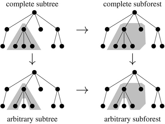 - Rosselló, F.; Valiente, G. An algebraic view of the relation between largest common subtrees and smallest common supertrees. Theor. Comput. Sci. 2006, 362, 33–53. [Google Scholar] [CrossRef]