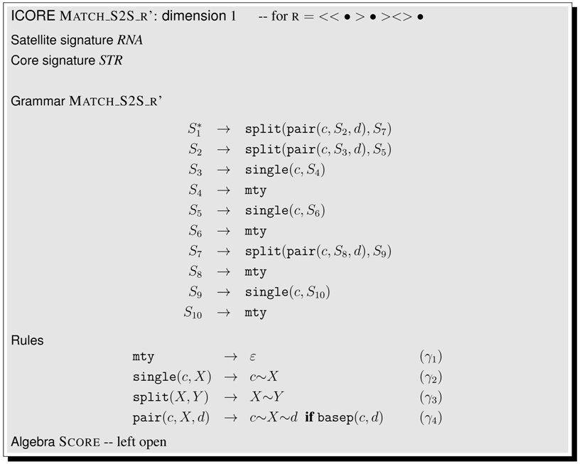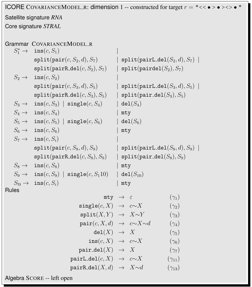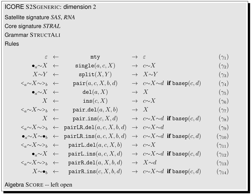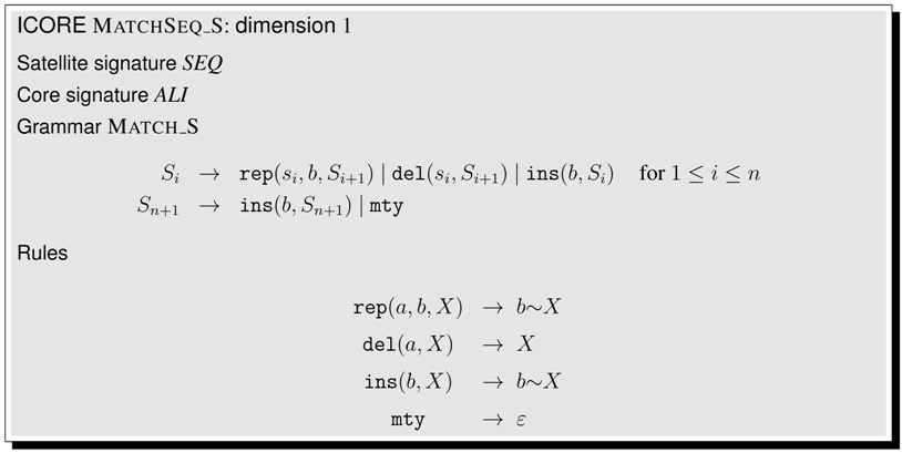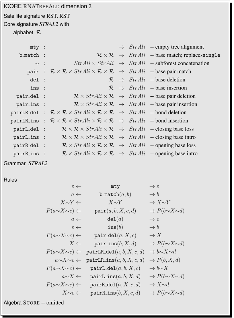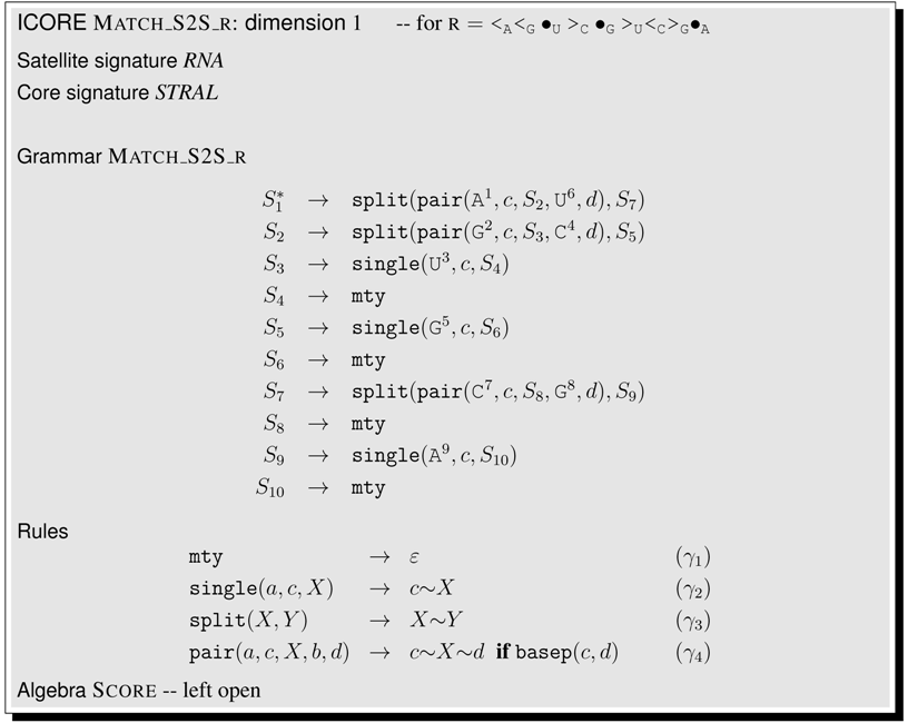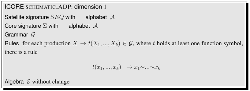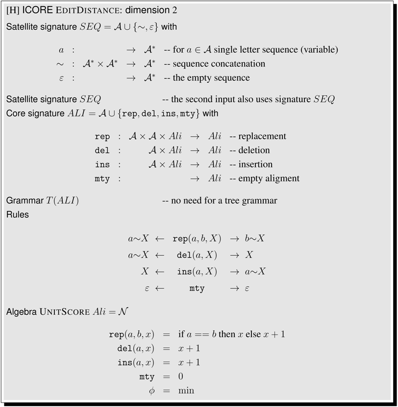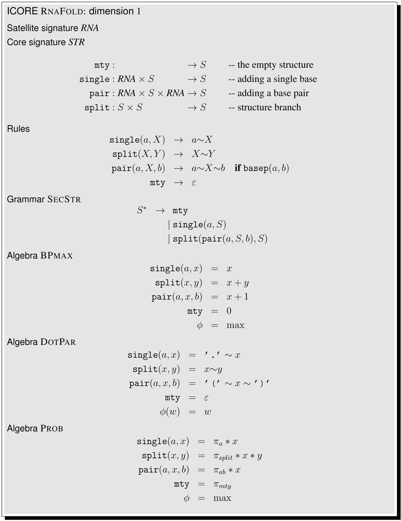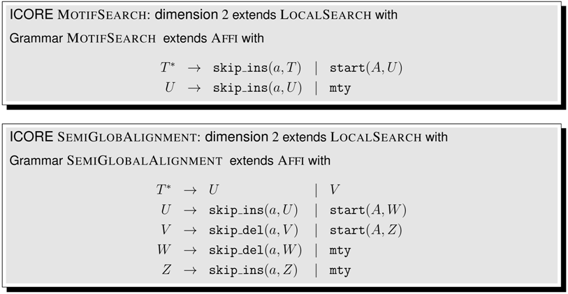 This article is organized as follows. Section 2 shows a first application example, even before the formal definitions are given. In Section 3, we collect technical definitions which are familiar from the literature. Readers with a strong background in these concepts may skip their formal exposition and jump right ahead. In Section 4, we formally introduce ICOREs. We suggest a pseudocode notation for writing ICOREs, add some notational conventions, and offer an ICORE design exercise to the reader. Then, we proceed to model various problems in biosequence and structure analysis. Section 5 discusses sequence comparison problems in various guises, Section 6 deals with folding RNA sequences into a secondary structure and related problems such as stochastic RNA family models, and Section 7 focuses on several variants of tree comparison and pattern matching. Table 1 summarizes the ICOREs presented in this manuscript. Curious readers are invited to skip all the technicalities and take a look ahead, to see how the problem they are most familiar with is dressed up as an ICORE. While Section 5, Section 6 and Section 7 are concerned with the construction of the search spaces for various problem types, Section 8 deals with the evaluation of search spaces, including the combined use of several scoring schemes and objective functions. In Section 9, we relate ICOREs to the present state-of-the-art in implementing algebraic dynamic programming, and to other computational models from older work. In the Conclusion, we review some design decisions that were made with this first exposition of ICOREs, and discuss the challenges of ICORE implementation.