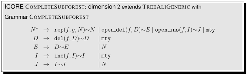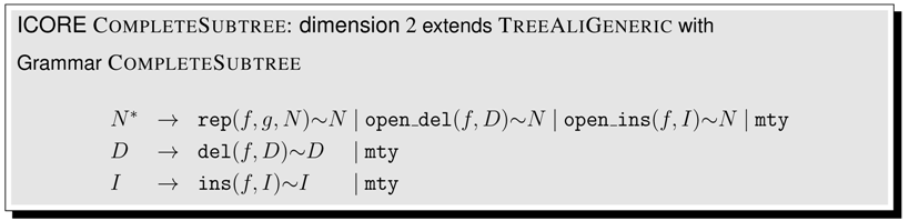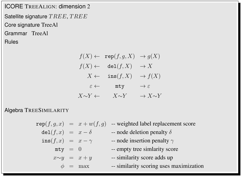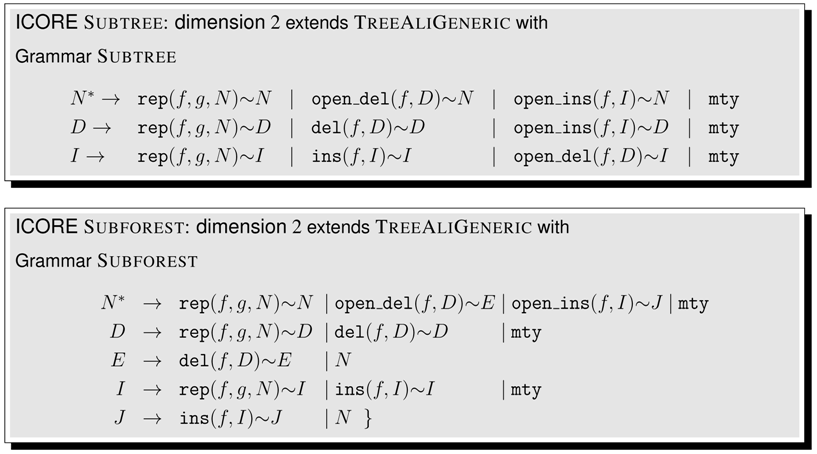 Prototyping ICOREs. ICOREs can be easily coded in a functional-logic language. In such a language, we can define some function f, specify a value y and solve equational queries such as , producing all instances of x that satisfy the query equation. We have used the functional-logic language Curry [] to prototype the ICOREs EditDitance and TreeAlign. Of course, the standard inference machine of such a language does not know that this particular type of query can be solved in polynomial time by employing dynamic programming. It actually implements a generate-and-test strategy over a search space of exponential size. We can only align trees up to five nodes in reasonable time. Still, this is a quick way to test if a given ICORE does what it is supposed to do. Languages such as Haskell, or Dyna could also be considered as host languages [,].