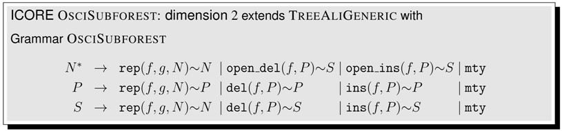 In optimization there are many situations where we want to restrict the set of admissible solutions to those satisfying additional criteria. To this end, we add to our formal machinery one more feature: We will use tree grammars to restrict the universe of candidates to a subset of the algebra of core terms. Let us come back to the string edit distance problem, and specialize it at hand. We now require that an edit script must not have two adjacent indels (insertion or deletion). This type of constraint is applied, for example, in RNA-RNA interaction. We design a tree grammar that restricts the candidate space accordingly: